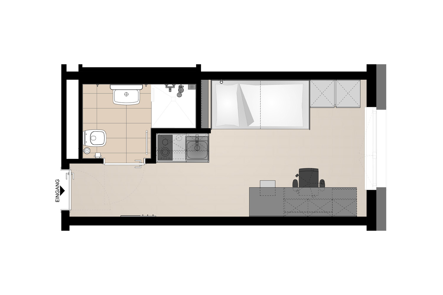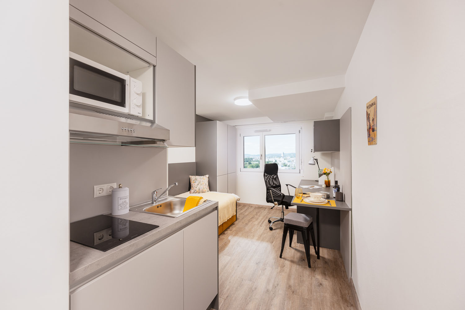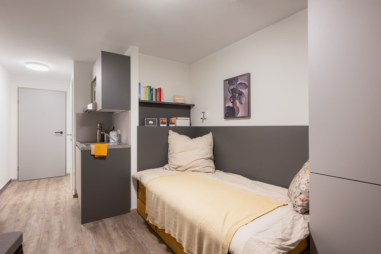 Unserer Einzelapartments bieten dir auf 18 m² alles, was du brauchst: eine vollausgestattete Kochnische mit Kühlschrank, ein modernes Bad mit Dusche, Waschbecken und WC sowie praktische Einbaumöbel im Wohn- und Schlafbereich. Hier hast du deinen eigenen Raum, um zu lernen, zu kochen, zu entspannen – ganz nach deinen Bedürfnissen.