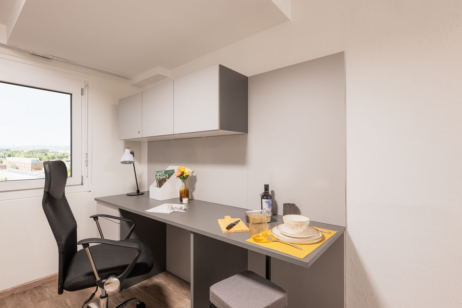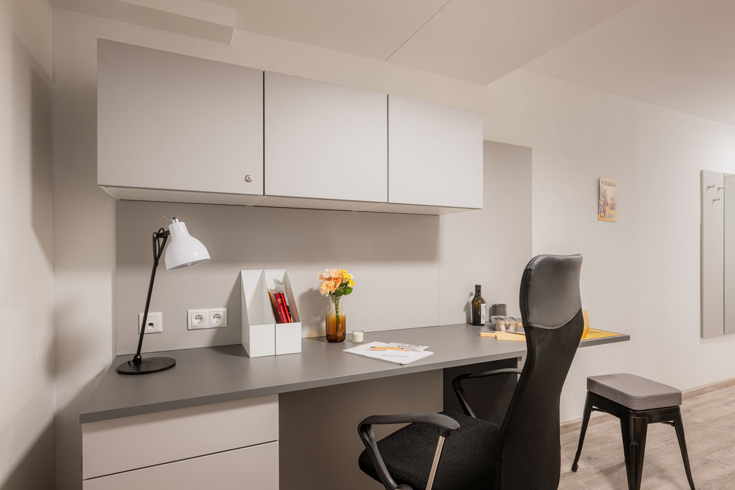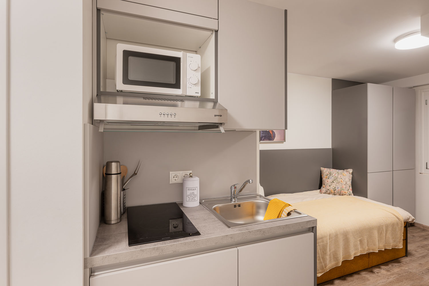 Unserer Einzelapartments bieten dir auf 18 m² alles, was du brauchst: eine vollausgestattete Kochnische mit Kühlschrank, ein modernes Bad mit Dusche, Waschbecken und WC sowie praktische Einbaumöbel im Wohn- und Schlafbereich. Hier hast du deinen eigenen Raum, um zu lernen, zu kochen, zu entspannen – ganz nach deinen Bedürfnissen.